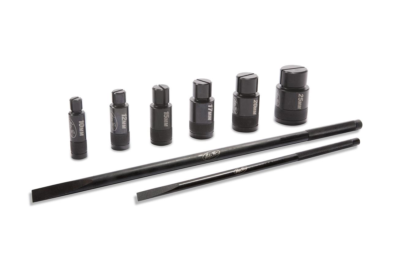 - 8 piece metric set includes large and small drivers, 10 mm, 12 mm, 15 mm, 17 mm, 20 mm, and 25 mm removers